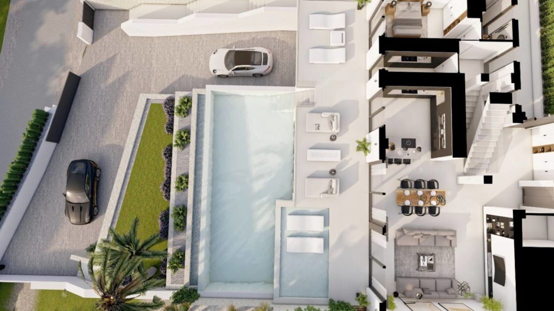 La maison a tout le confort pour en profiter. La maison est accessible par un grand hall d’entrée auquel on accède en traversant un escalier latéral qui borde la villa. Le hall d’entrée se connecte à un beau salon-salle à manger et à la cuisine américaine, le tout avec des vues spectaculaires sur la grande terrasse couverte et la piscine à débordement. Également à ce rez-de-chaussée il y a une buanderie à côté de la cuisine et une chambre complète avec salle de bain en suite. De plus, il y a des toilettes invités à côté de l’entrée.